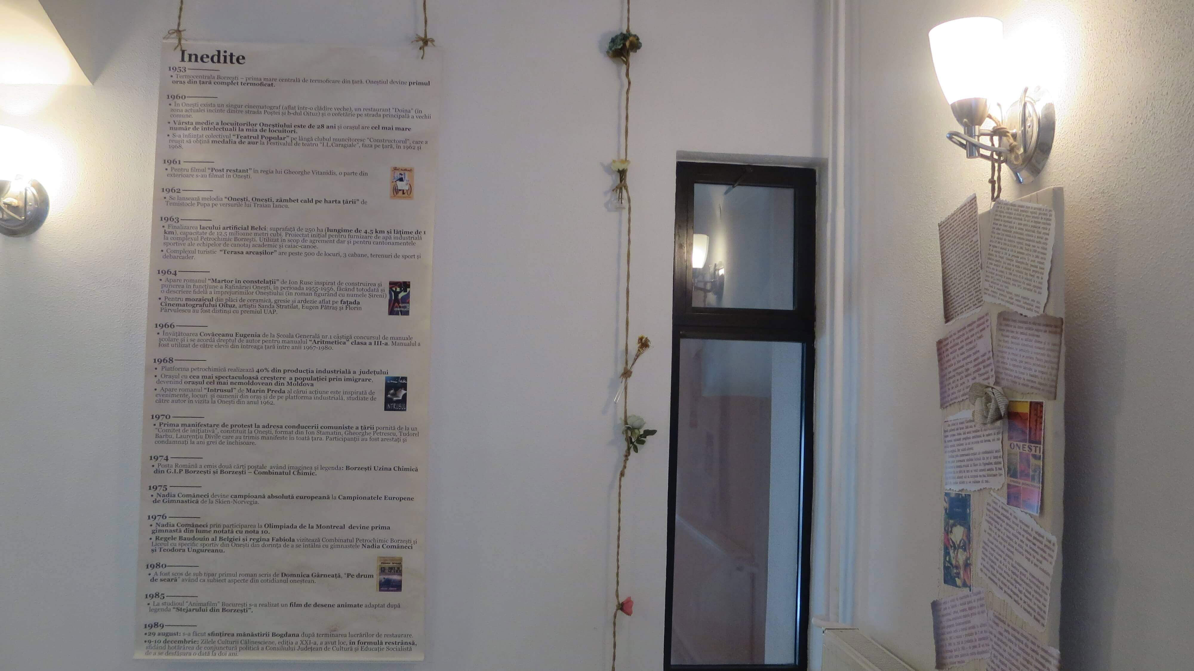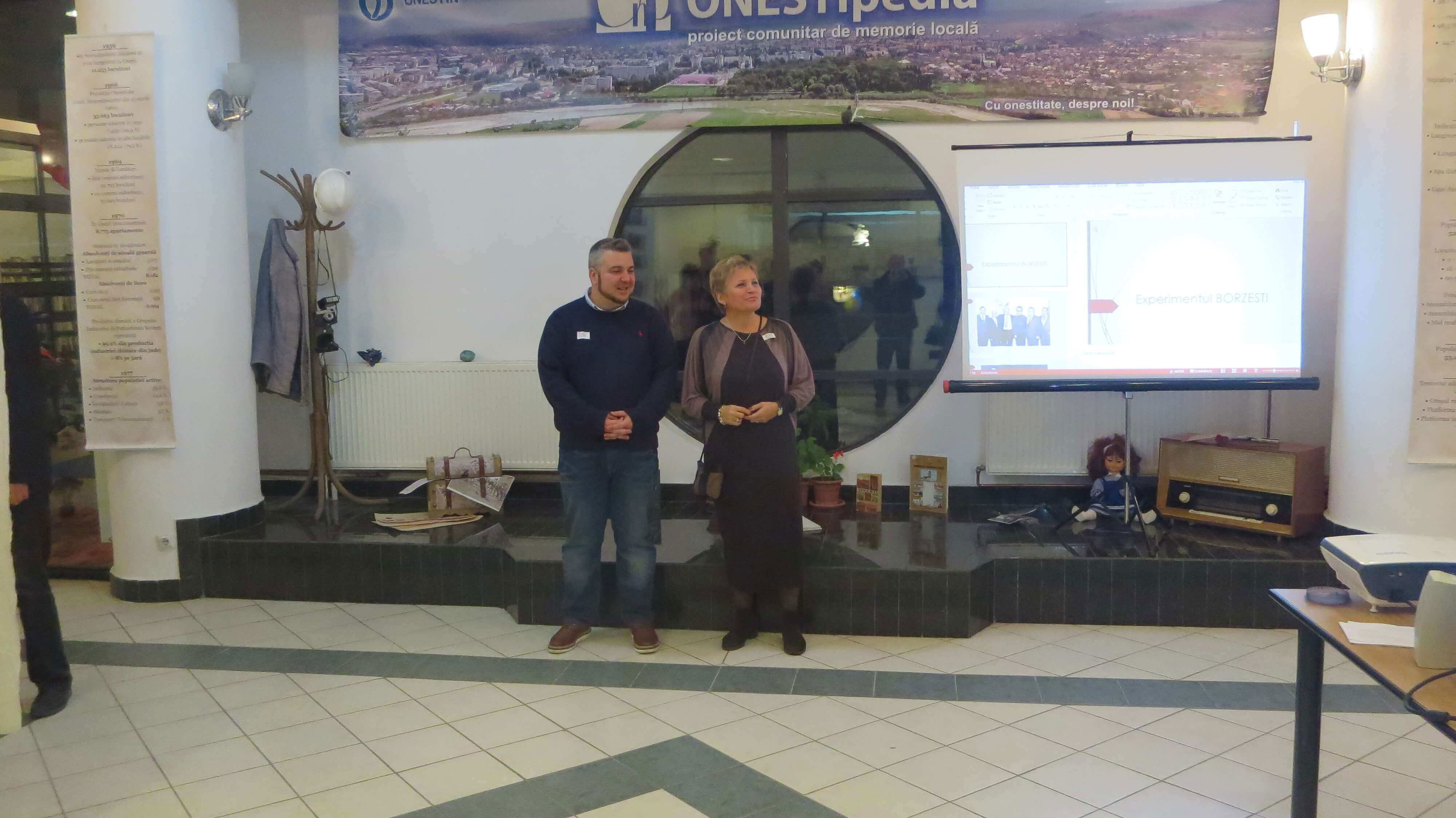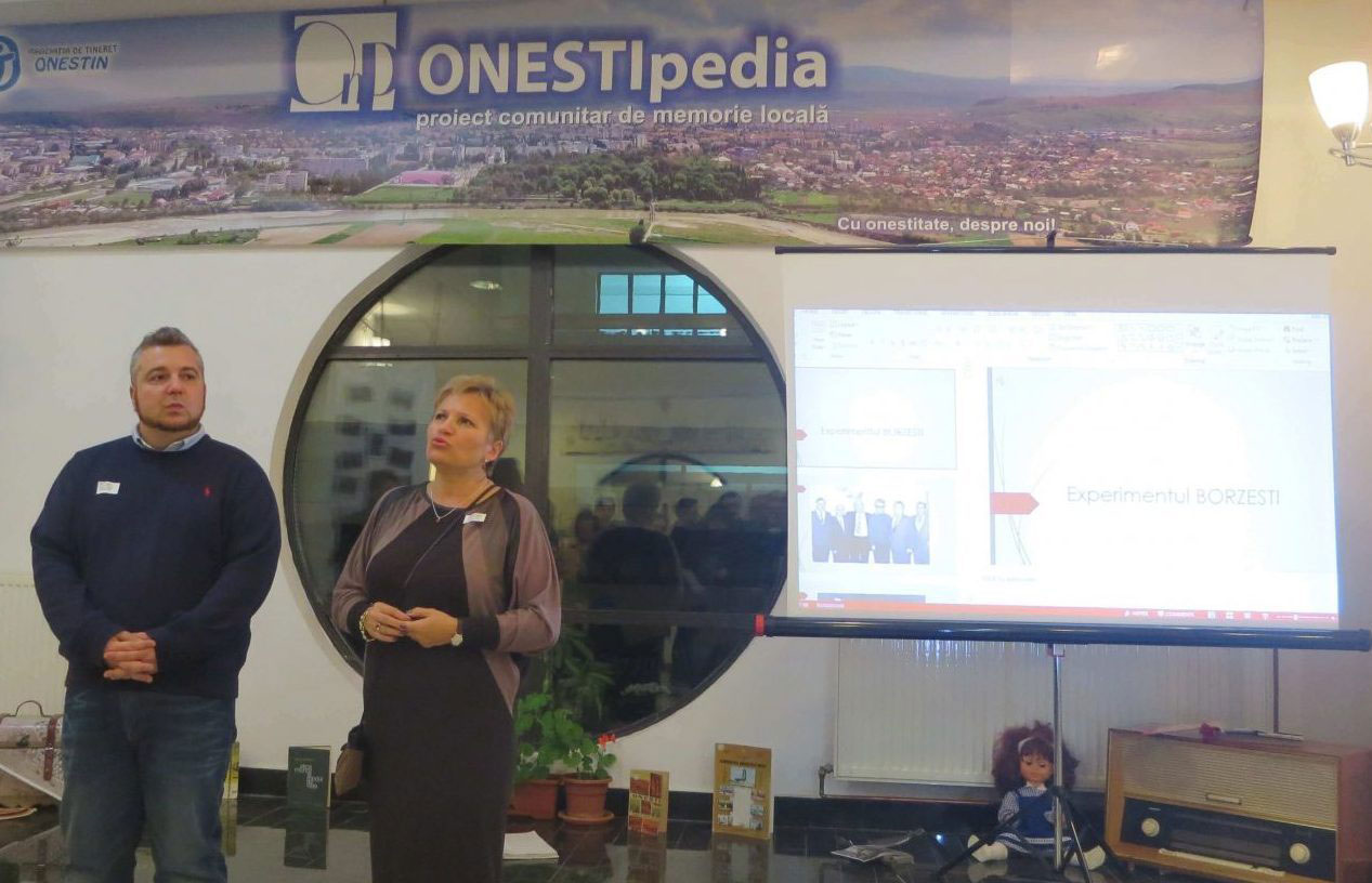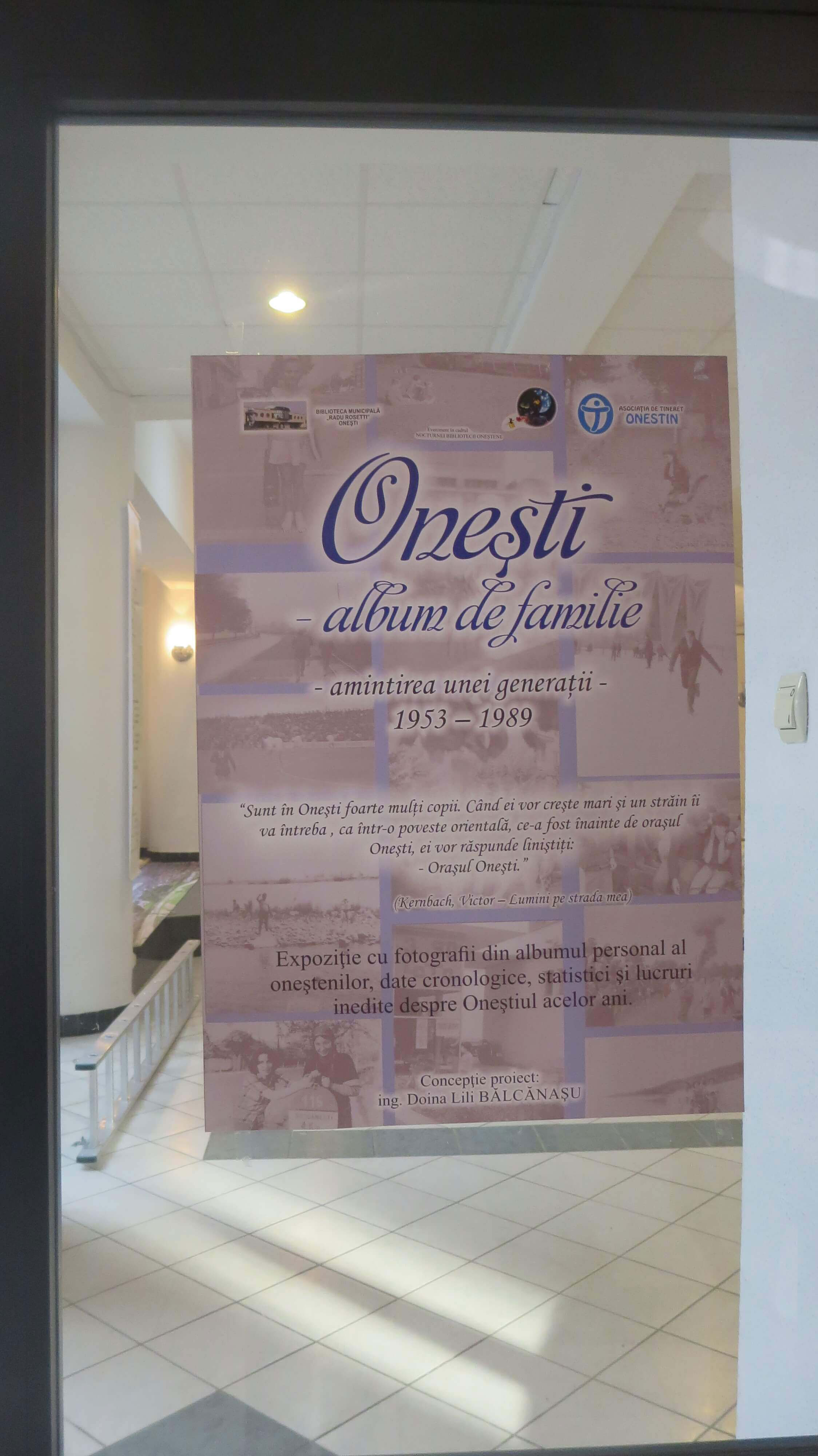 La Nocturna bibliotecii oneștene, din 11 noiembrie 2016, am reeditat expoziția “ONEȘTI – album de familie – amintirea unei generații, 1953-1989” prin asumarea și încrederea acordată de către noul director al bibliotecii precum și prin frumoasa primire din partea foștilor colegi bibliotecari. Sprijinul necondiționat din partea faimoasei, deja, echipe Onestin: Diana, Ancuța și Alina a venit ca o împlinire a bunelor noastre relații dând o notă de inedit unei expoziții ce și-a primit dreptul de a se desfășura într-un cadru propice. Publicul eterogen, specific fiecărei Nocturne, dar mai ales cel care a venit special pentru acest vernisaj a fost pus în temă și cu lansarea acestui site dedicat oneștenilor perioadei 1953-1989. Fostul meu coleg Tudor Găureanu mi-a fost alături prin prezentarea proiecției “Experimentul Borzești” precum și foștii colegi de pe platforma industrială. Totodată mi-am descoperit, coborâtă parcă din fotografiile expuse, o veche prietenă din incinta de pe Poștei, Laura, pe care nu o mai văzusem de peste 40 de ani.