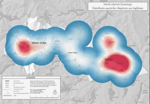 Hartă calorică (heatmap) Distribuția așezărilor dispărute sau înglobate (lucrare de licență: Evoluția rețelei de așezări de pe Valea Trotușului dintre Onești și Târgu Ocna)